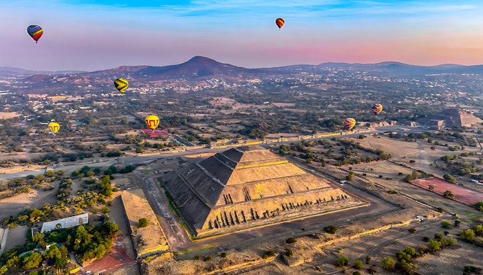 Teotihuacán est un vaste site archéologique situé dans le bassin du Mexique, à environ 40 kilomètres (31 miles) au nord-est de Mexico. Les ruines sont situées dans une vallée, entourée de montagnes, ce qui donne aux visiteurs une idée de l'ampleur et de la grandeur qui caractérisaient autrefois la ville antique. Bien qu'elle ne soit pas directement située dans les limites de Mexico, sa proximité en fait une destination d'excursion d'une journée populaire et accessible. Souvent appelé "pyramides près de Mexico", le site lui-même est géré dans le cadre de la municipalité de Teotihuacán, dans l'État de Mexico.